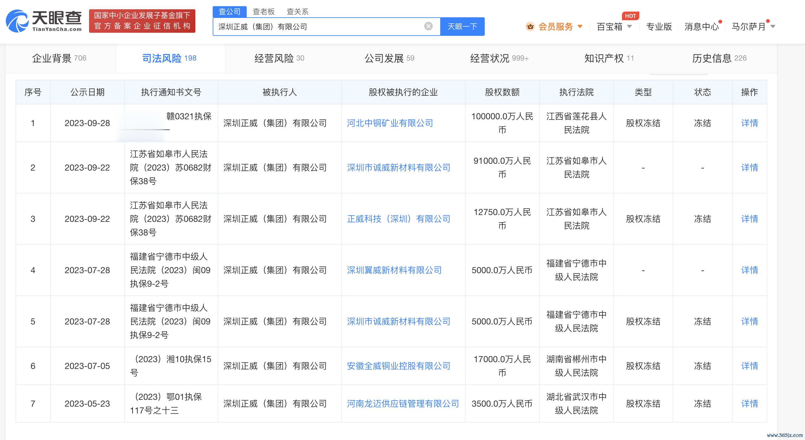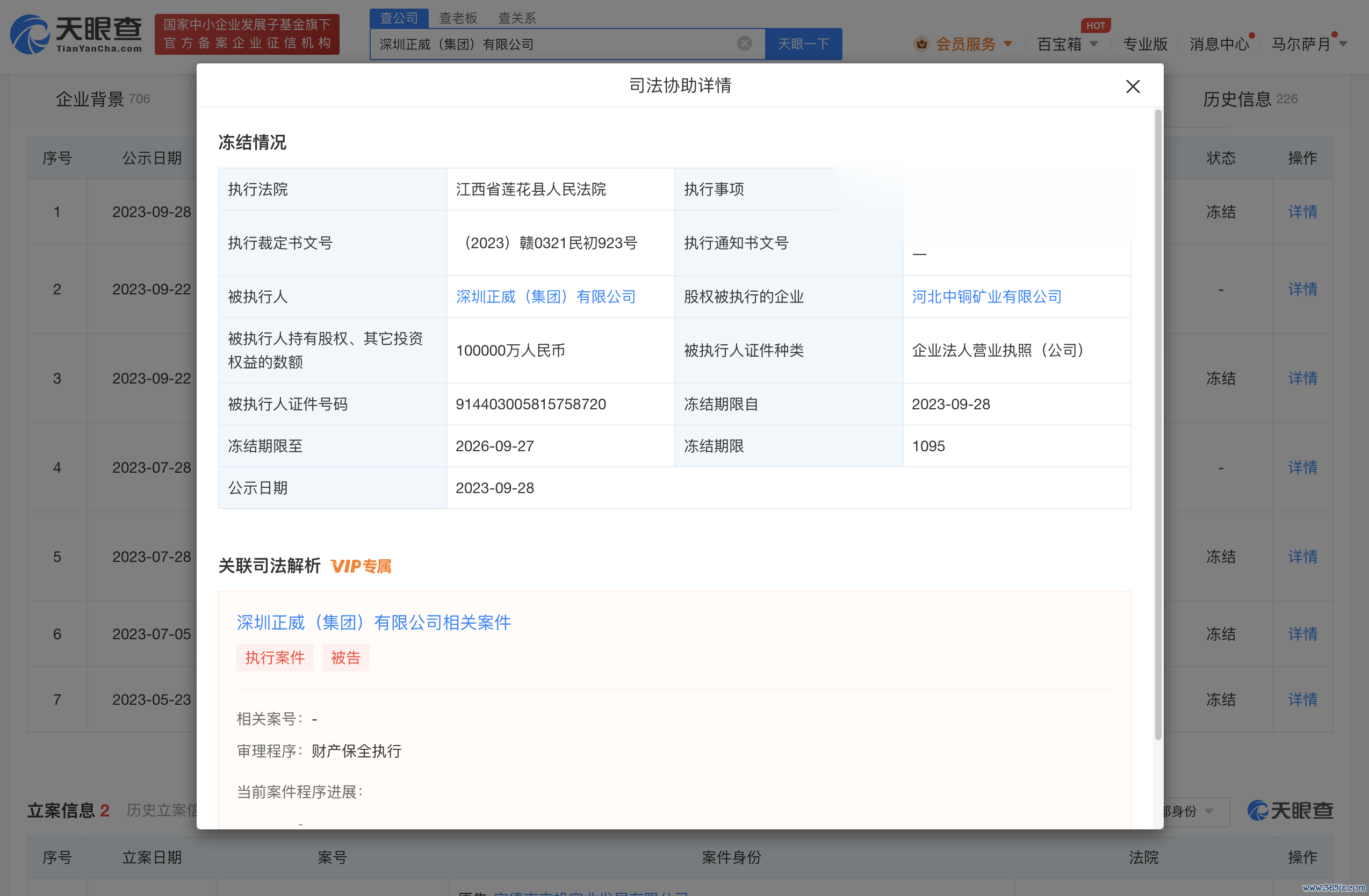 天眼查App显示,近日,深圳正威(集团)有限公司新增一则股权冻结信息,冻结股权数额10亿人民币,股权被执行的企业为其全资子公司河北中铜矿业有限公司,执行法院为江西省莲花县人民法院。